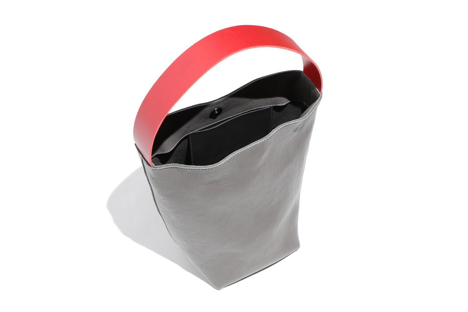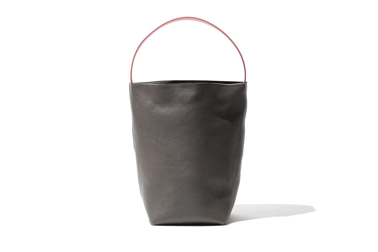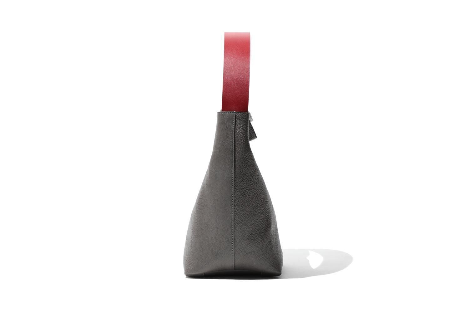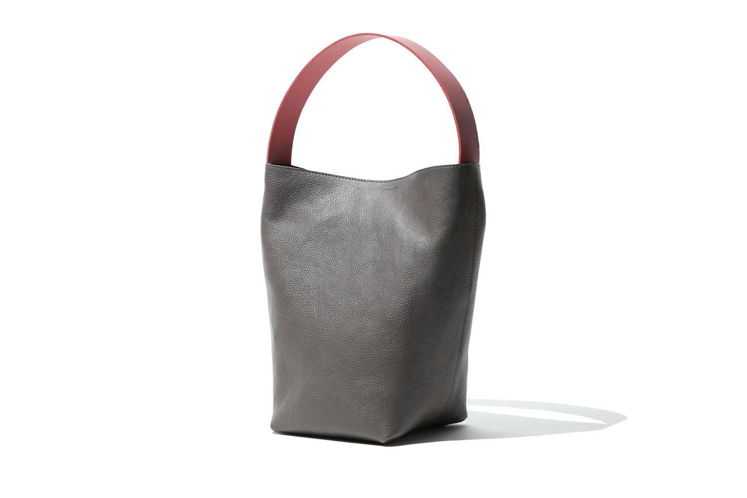 湾曲するハンドルと下を支えるグレーの牛革のバッグは、シンプルながら空間を飾るオブジェのように