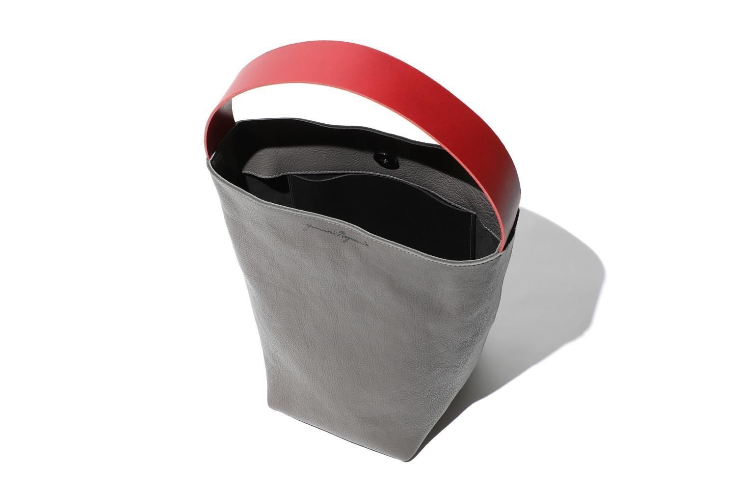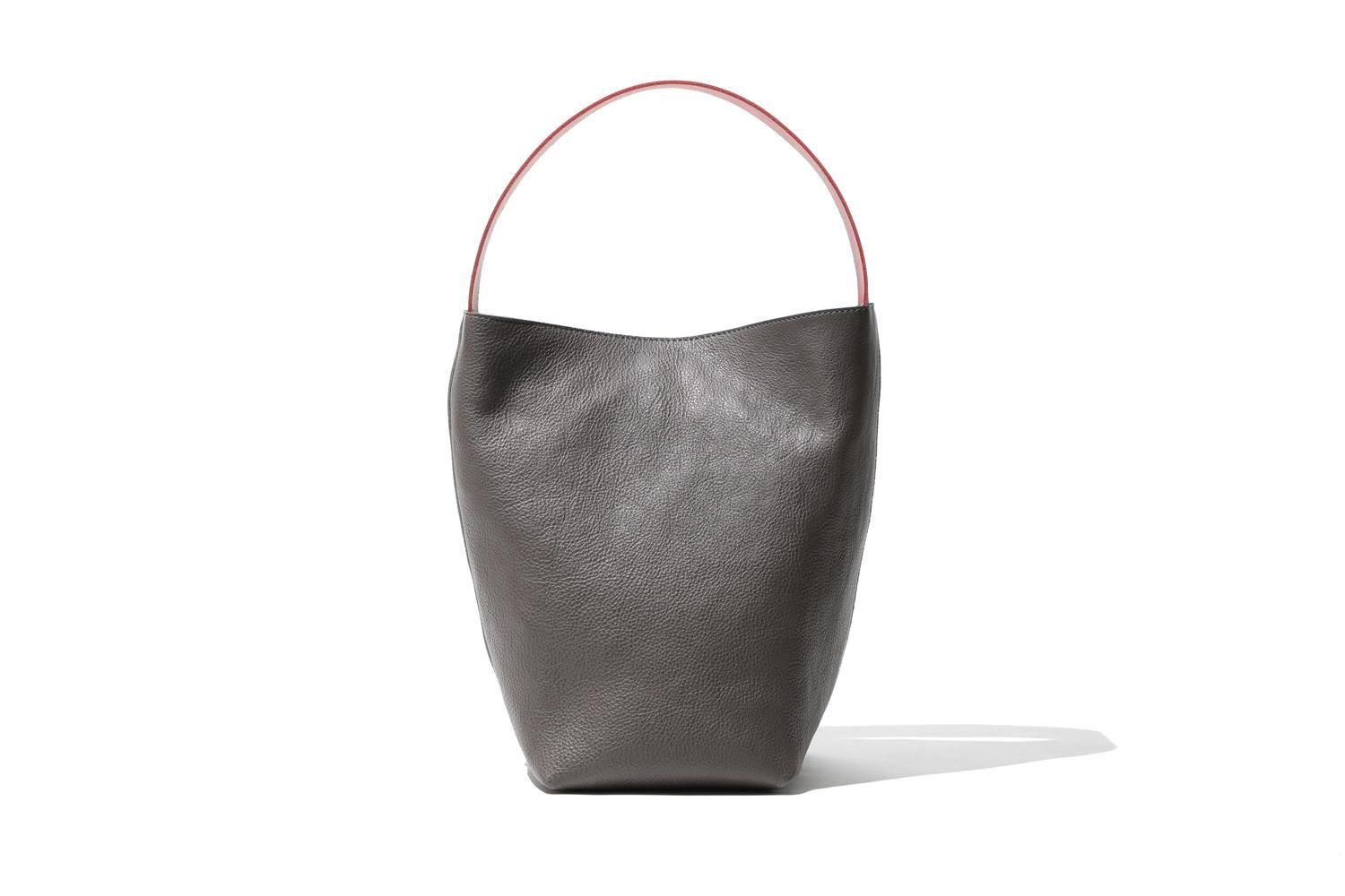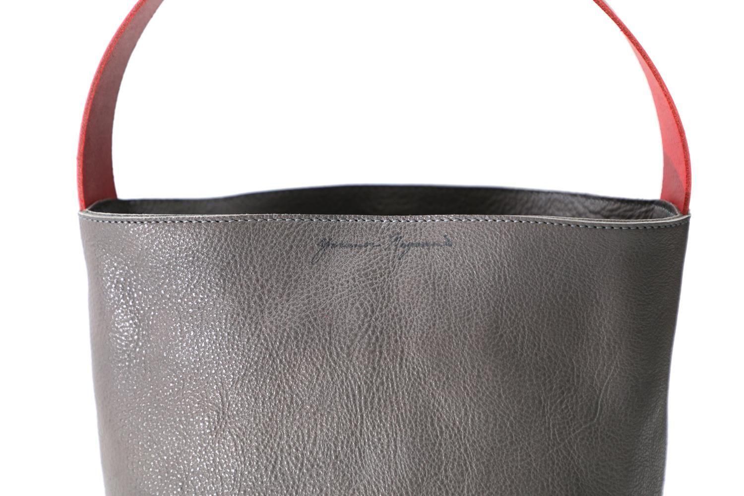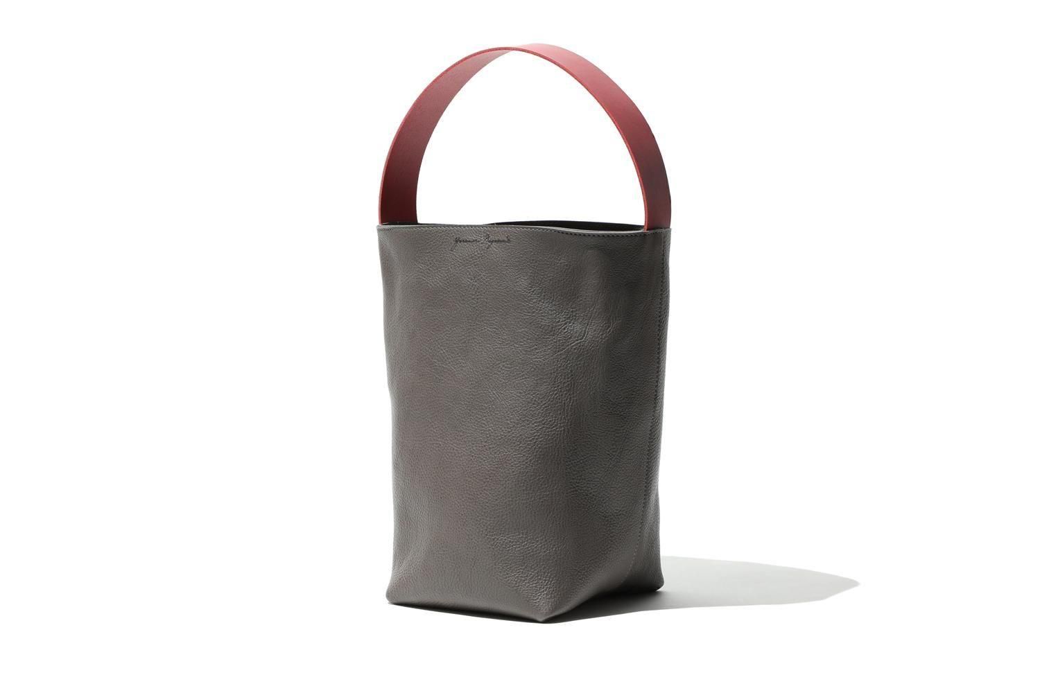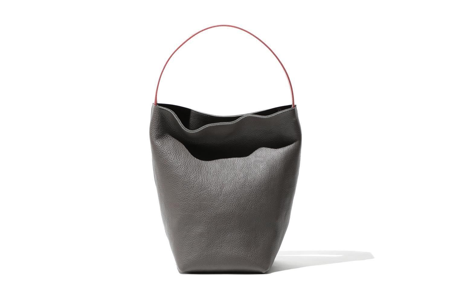 湾曲するハンドルと下を支えるグレーの牛革のバッグは、シンプルながら空間を飾るオブジェのように
