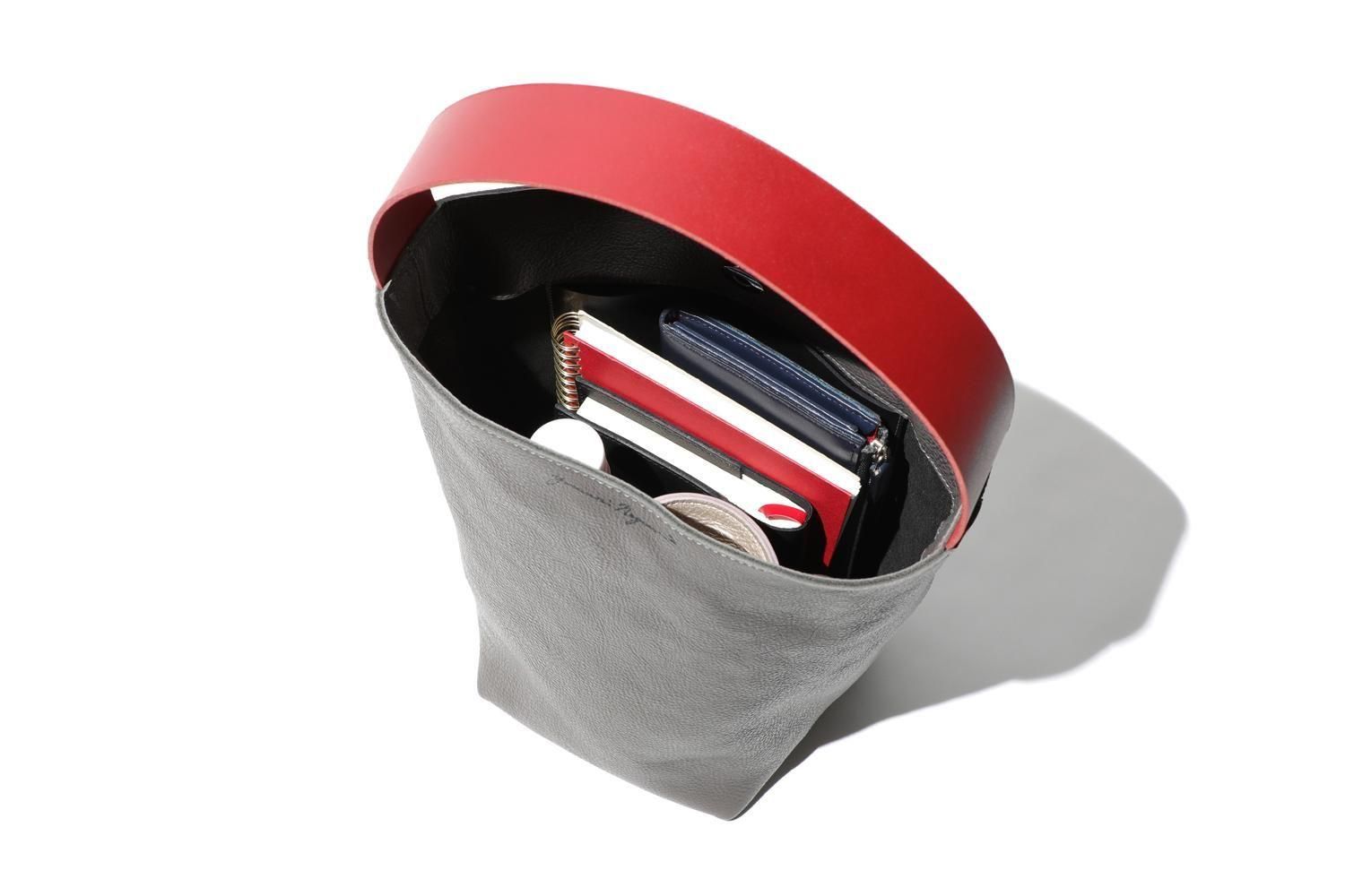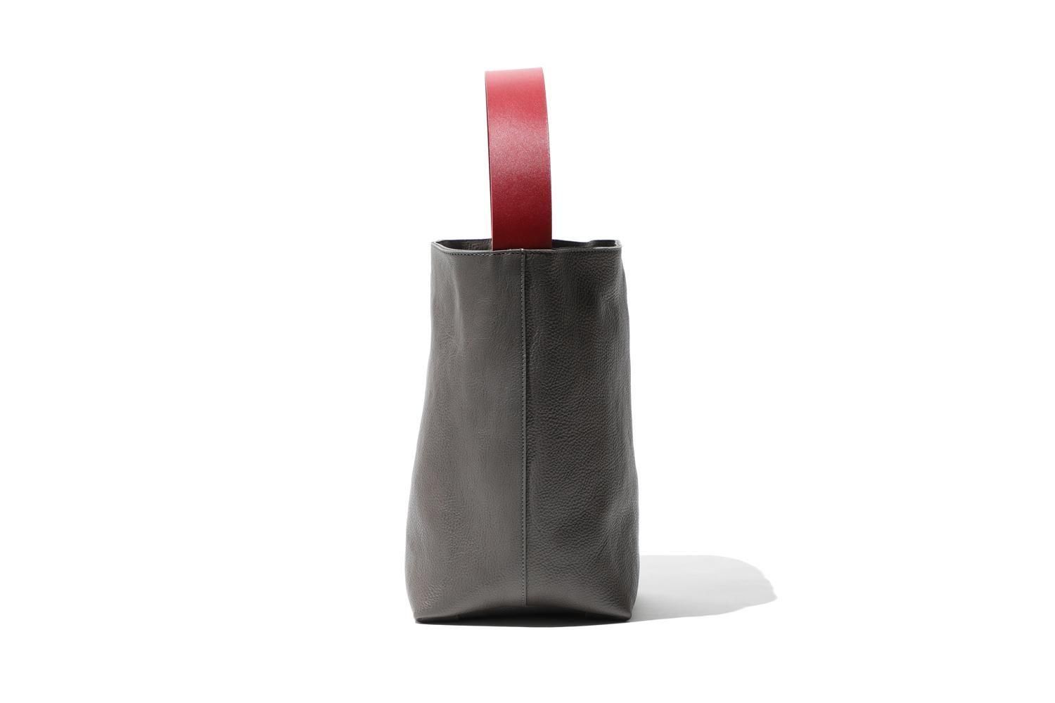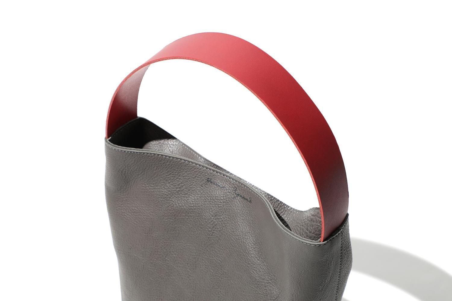 赤が印象的なハンドルは、厚みとハリがある牛革を使いそのまま自立します。